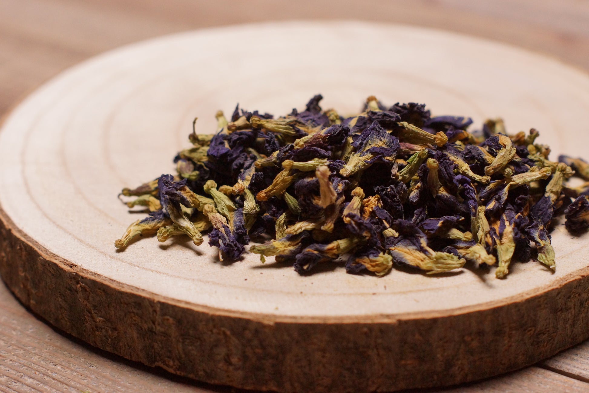 Thé aux fleurs de papillon : à partir de fleurs séchées – d'un beau bleu qui vire au violet avec une touche de citron