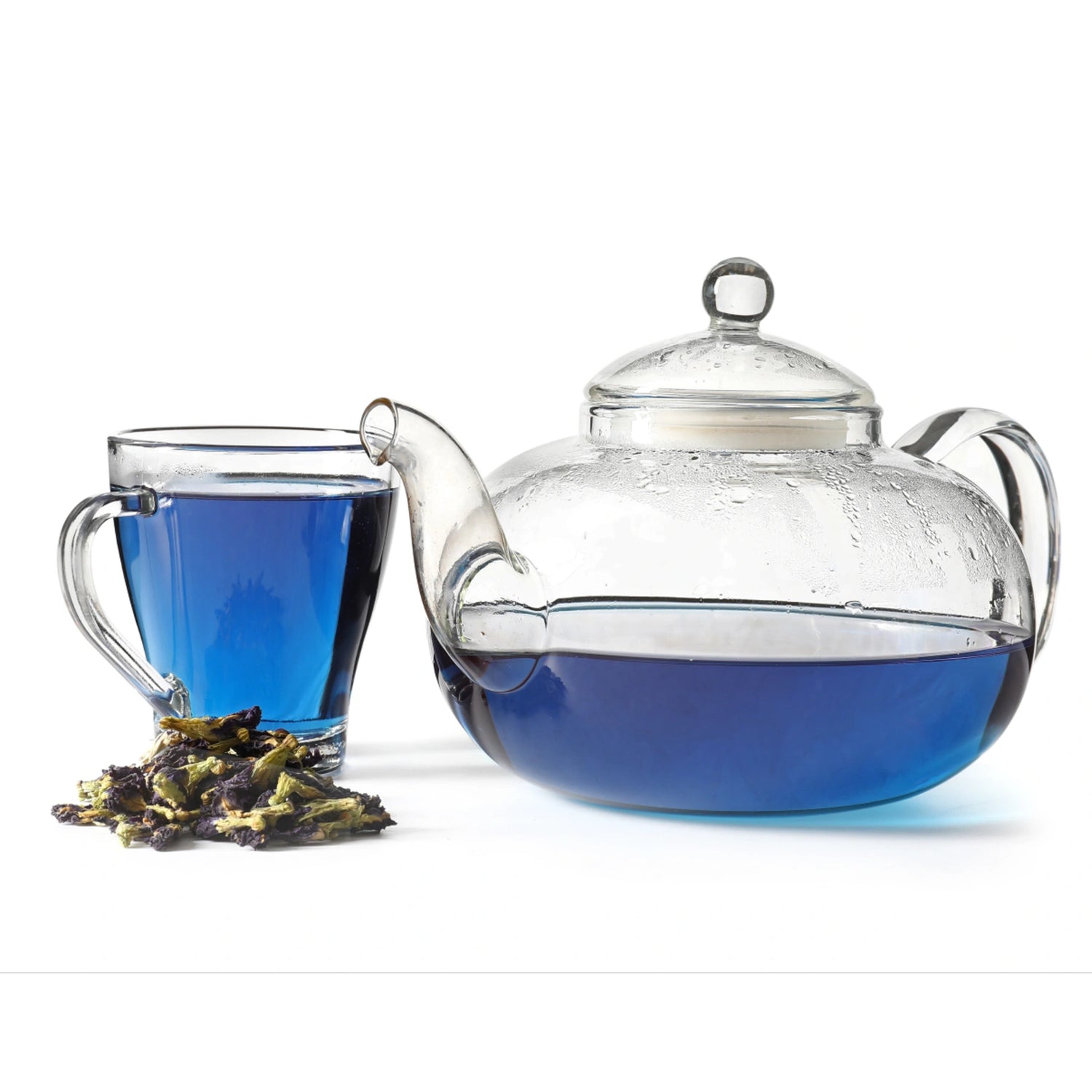 De opvallende blauwe kleur van deze thee komt volledig natuurlijk van de Butterfly Pea Flower (kittelbloem). Deze bloem kleurt het water diepblauw en kan zelfs paars worden als je er wat citroen aan toevoegt.
