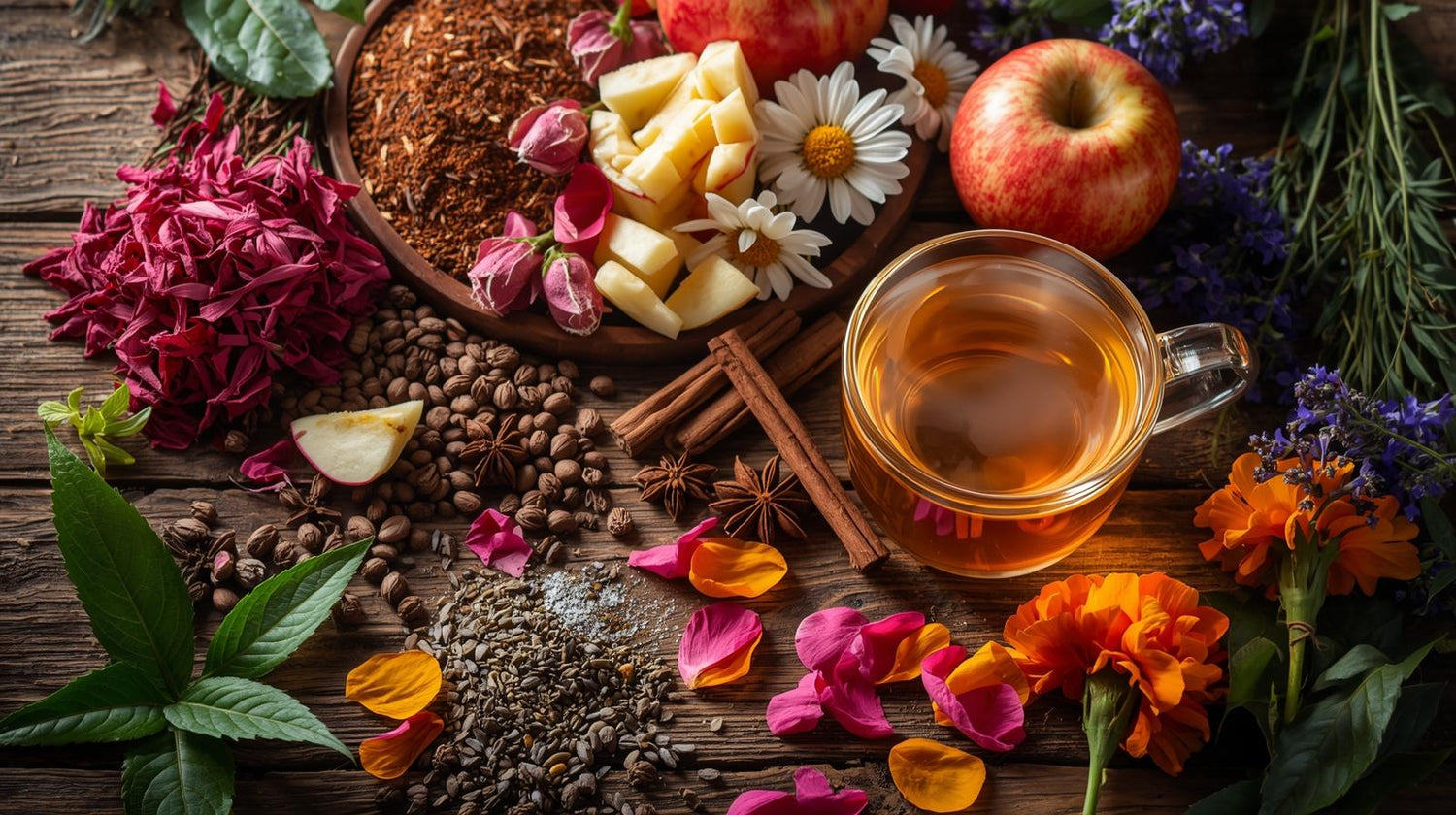 Rooibos, appel, rozenknopjes, kaneel, wilde kamille, anijszaad, lavendel, roze peperkorrels en goudsbloem.