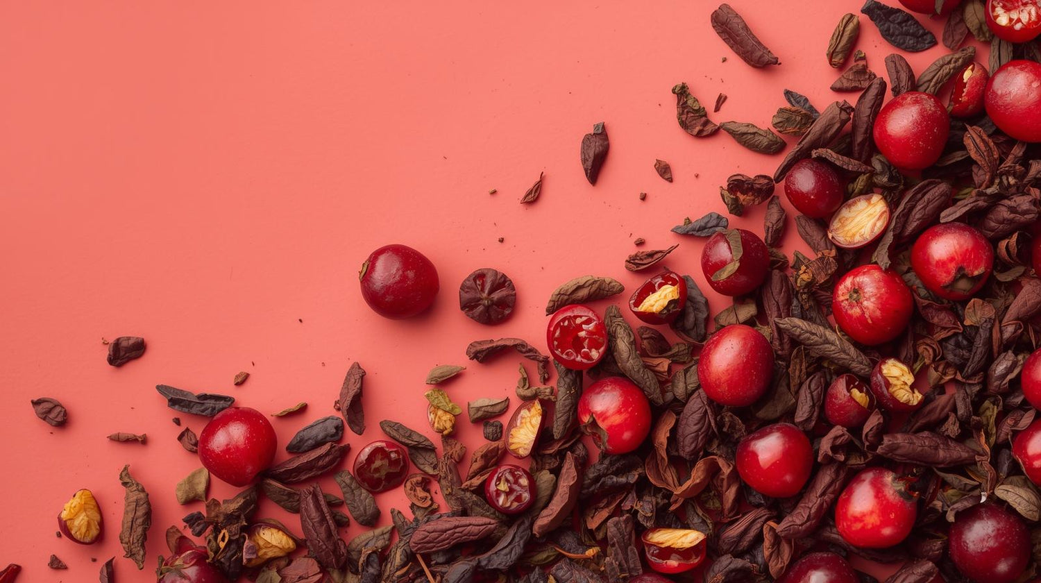 Rooibos, cranberrystukjes, aroma en saffloerbloesem.