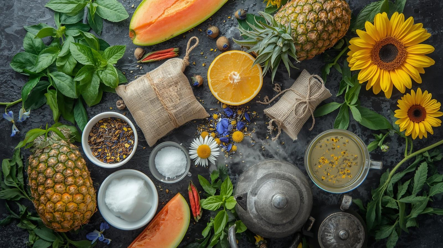 Groene thee, papaya, ananas (rietsuiker, ananas, citroenzuur), meloen, suiker, aroma, kamille, blauwe korenbloem en zonnebloembloesem