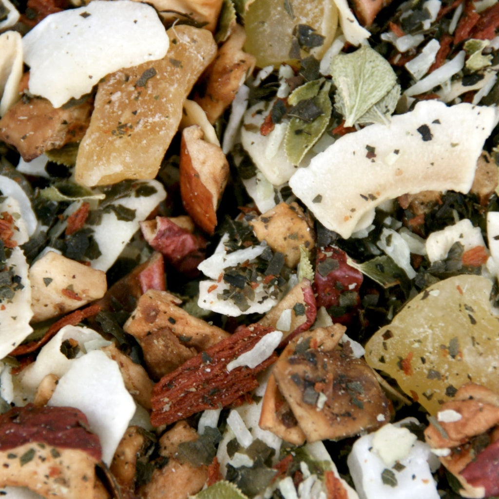 Appelstukjes, meloenstukjes (meloen, suiker, citroenzuur), kokosblokjes, -smiles, -gemalen, suiker, bramenblad, tomaat, aroma, buchu.