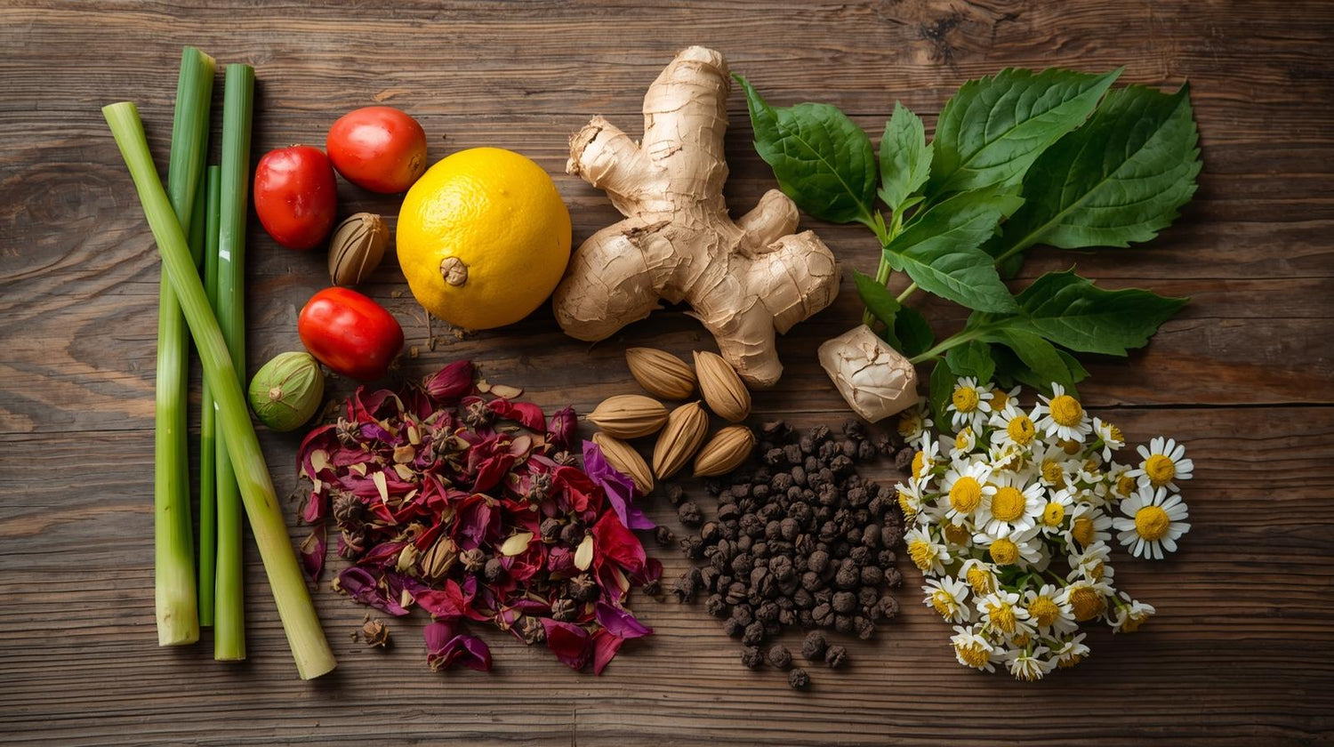 Rozenbottel, citroengras, gember, kardemom, brandnetel, zwarte peper, rozenblad