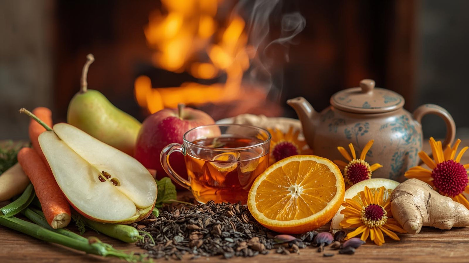 Peerstukjes, appelstukjes, wortelstukjes, gember, Japan Gen Mai Cha, sinaasappelschijfjes, aroma, sinaasappelschil en saffloerbloesem.