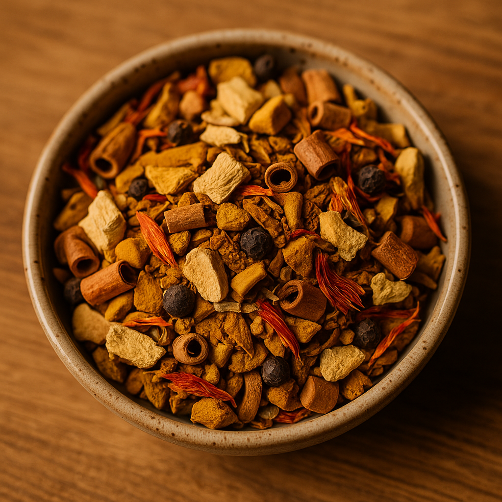 Vurig Goud is een verwarmende en kruidige blend van gember, kurkuma, kaneel, zwarte peper en saffloerbloesem. Deze krachtige combinatie staat bekend om haar stimulerende werking op de spijsvertering en natuurlijke ondersteuning van het immuunsysteem.