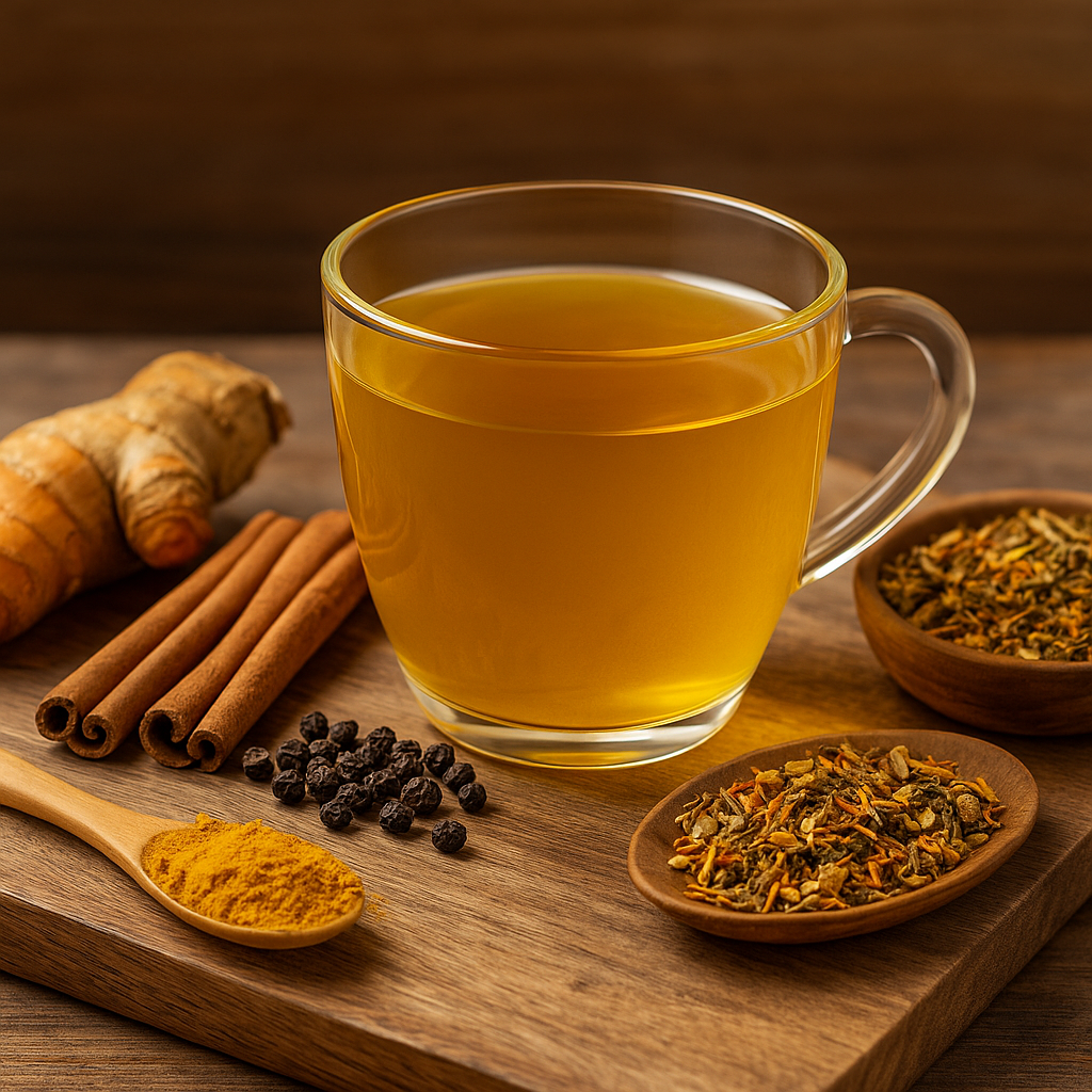 De smaak is kruidig en verwarmend. Gember en kurkuma geven een pittige kick, kaneel voegt een zachte zoetheid toe en saffloerbloesem brengt een subtiel bloemige ondertoon. De zwarte peper versterkt niet alleen de werking van kurkuma, maar geeft ook een lichte punch.